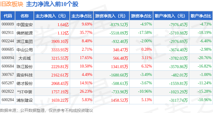 从资金流向上来看,当日旧改板块主力资金净流出4.32亿元,游资资金净流出1.23亿元,散户资金净流入5.55亿元。旧改板块个股资金流向见下表: