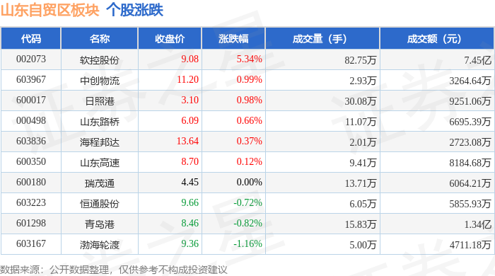 证券之星消息,9月29日山东自贸区板块较上一交易日上涨0.16%,软控股份领涨。当日上证指数报收于3862.53,上涨0.9%。深证成指报收于13479.43,上涨2.05%。山东自贸区板块个股涨跌见下表: