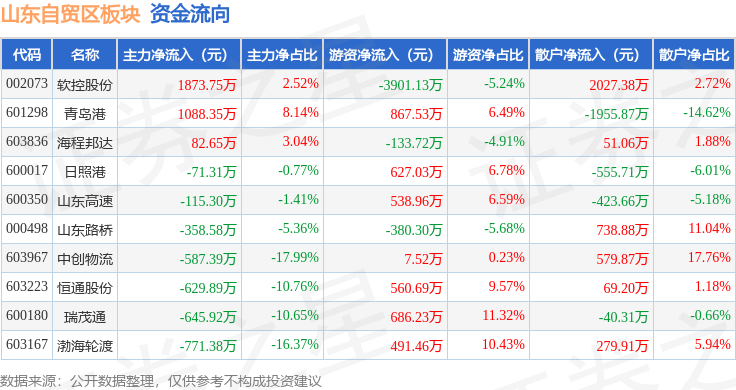 从资金流向上来看,当日山东自贸区板块主力资金净流出135.03万元,游资资金净流出635.73万元,散户资金净流入770.76万元。山东自贸区板块个股资金流向见下表: