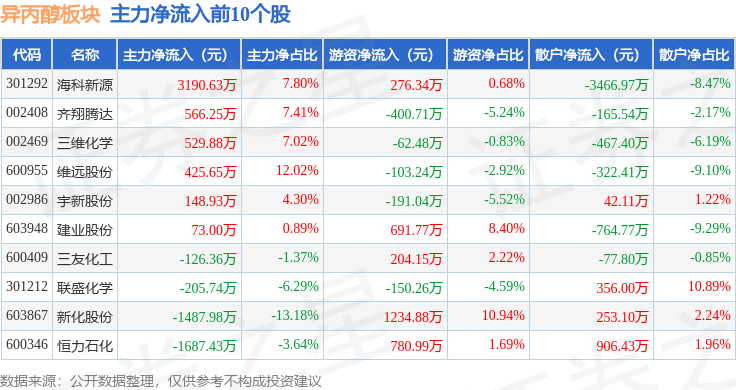 从资金流向上来看,当日异丙醇板块主力资金净流出1.18亿元,游资资金净流入6053.67万元,散户资金净流入5793.11万元。异丙醇板块个股资金流向见下表: