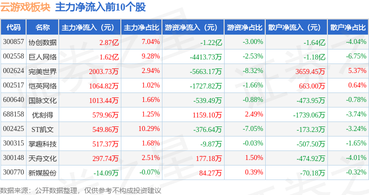 从资金流向上来看,当日云游戏板块主力资金净流出6.71亿元,游资资金净流入8282.95万元,散户资金净流入5.88亿元。云游戏板块个股资金流向见下表: