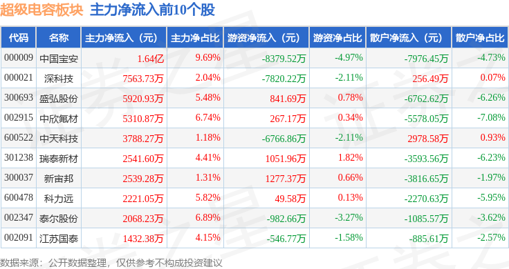 从资金流向上来看,当日超级电容板块主力资金净流入1933.03万元,游资资金净流出3.75亿元,散户资金净流入3.55亿元。超级电容板块个股资金流向见下表: