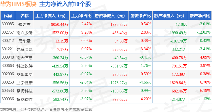 从资金流向上来看,当日华为HMS板块主力资金净流出2.97亿元,游资资金净流入1.28亿元,散户资金净流入1.69亿元。华为HMS板块个股资金流向见下表: