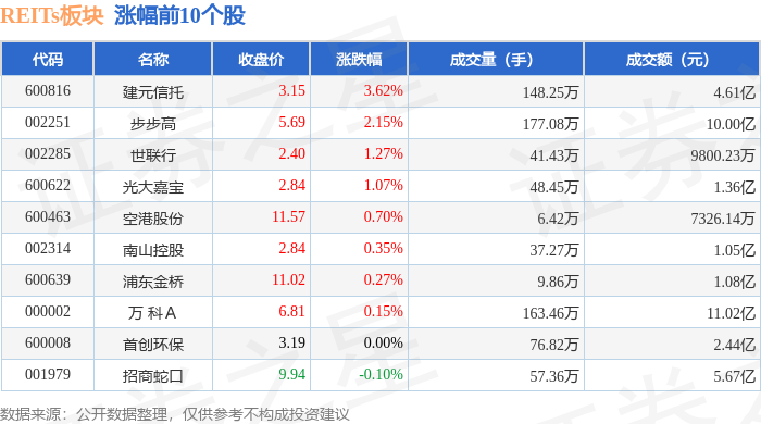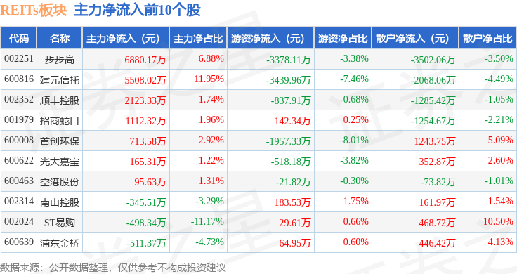 从资金流向上来看,当日REITs板块主力资金净流出6.56亿元,游资资金净流出3998.97万元,散户资金净流入6.96亿元。REITs板块个股资金流向见下表: