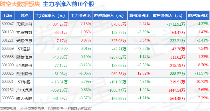从资金流向上来看,当日时空大数据板块主力资金净流出5.11亿元,游资资金净流入6524.5万元,散户资金净流入4.46亿元。时空大数据板块个股资金流向见下表: