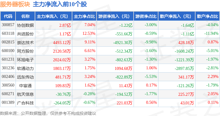 从资金流向上来看,当日服务器板块主力资金净流出15.66亿元,游资资金净流出1.65亿元,散户资金净流入17.31亿元。服务器板块个股资金流向见下表: