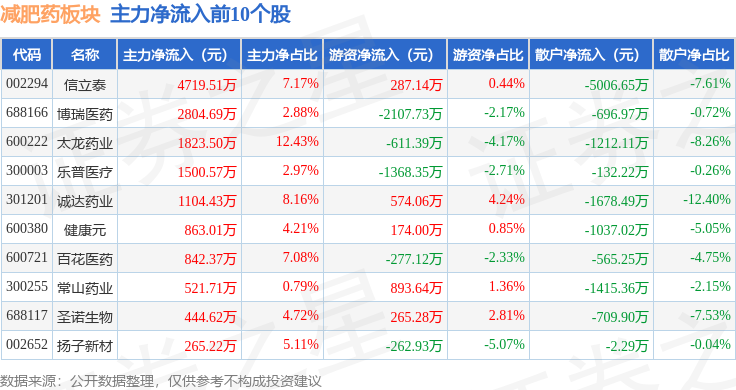 从资金流向上来看,当日减肥药板块主力资金净流出6.89亿元,游资资金净流入1.56亿元,散户资金净流入5.33亿元。减肥药板块个股资金流向见下表: