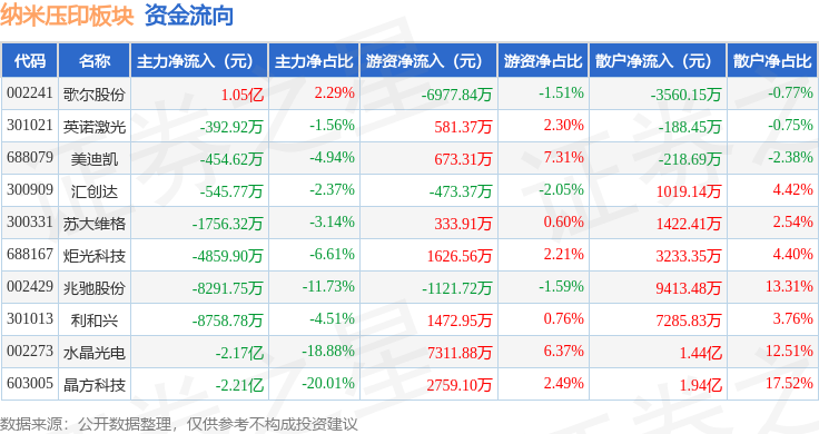 从资金流向上来看,当日纳米压印板块主力资金净流出5.83亿元,游资资金净流入6186.15万元,散户资金净流入5.22亿元。纳米压印板块个股资金流向见下表: