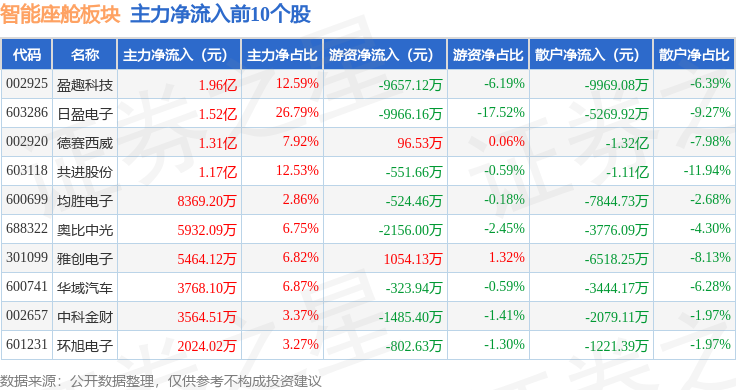 从资金流向上来看,当日智能座舱板块主力资金净流出3.03亿元,游资资金净流出3273.29万元,散户资金净流入3.36亿元。智能座舱板块个股资金流向见下表: