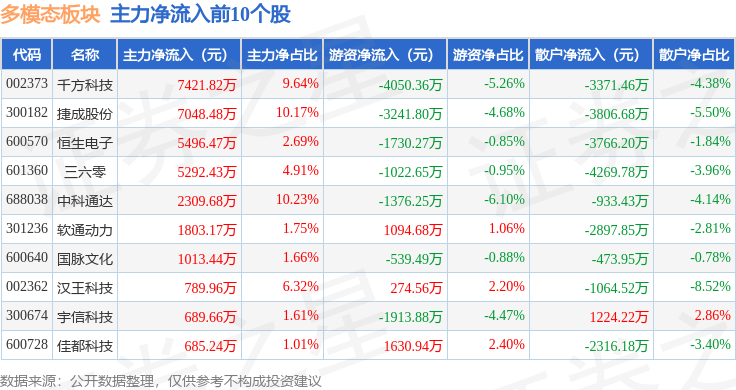 从资金流向上来看,当日多模态板块主力资金净流出14.25亿元,游资资金净流入2.52亿元,散户资金净流入11.74亿元。多模态板块个股资金流向见下表: