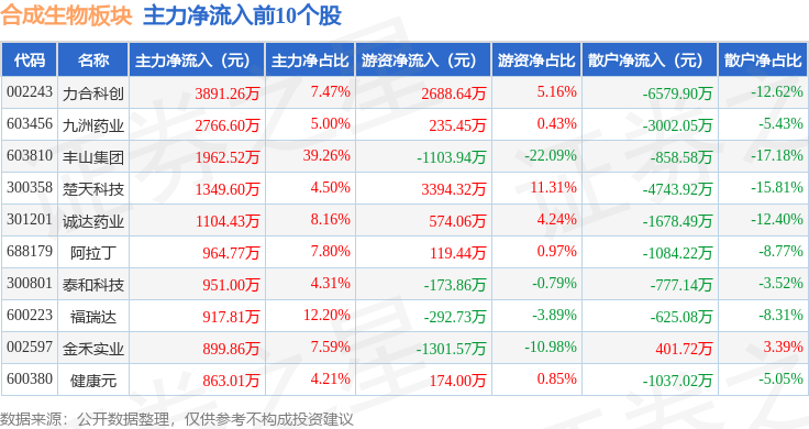 从资金流向上来看,当日合成生物板块主力资金净流出9.35亿元,游资资金净流入2.76亿元,散户资金净流入6.59亿元。合成生物板块个股资金流向见下表: