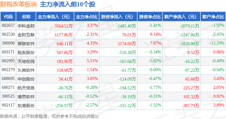 从资金流向上来看,当日财税改革板块主力资金净流出2.25亿元,游资资金净流入4296.96万元,散户资金净流入1.82亿元。财税改革板块个股资金流向见下表:
