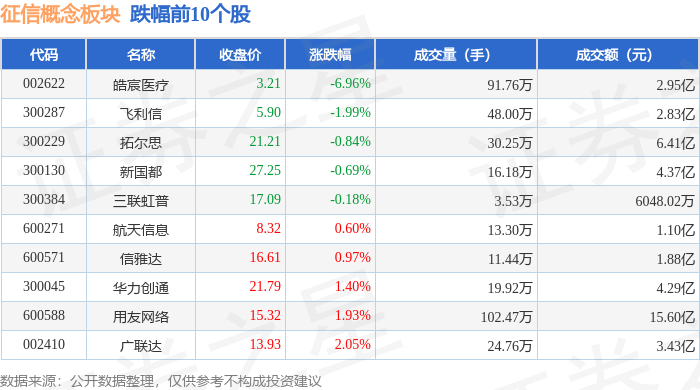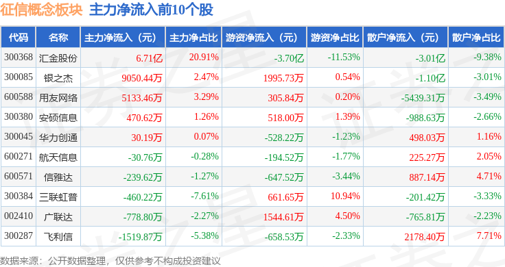 从资金流向上来看,当日征信概念板块主力资金净流入6.79亿元,游资资金净流出3.5亿元,散户资金净流出3.29亿元。征信概念板块个股资金流向见下表: