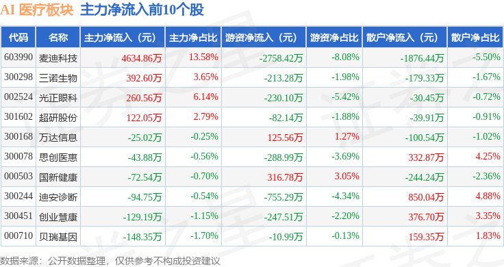 从资金流向上来看,当日AI 医疗板块主力资金净流出2.28亿元,游资资金净流入1168.85万元,散户资金净流入2.17亿元。AI 医疗板块个股资金流向见下表: