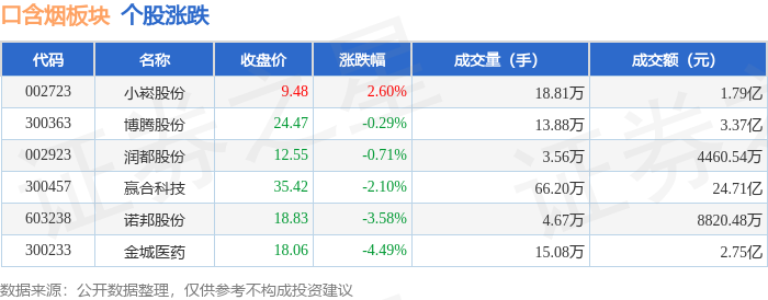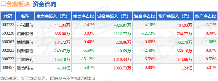 从资金流向上来看,当日口含烟板块主力资金净流出1.79亿元,游资资金净流入1861.9万元,散户资金净流入1.6亿元。口含烟板块个股资金流向见下表: