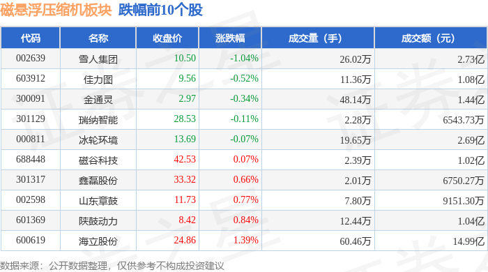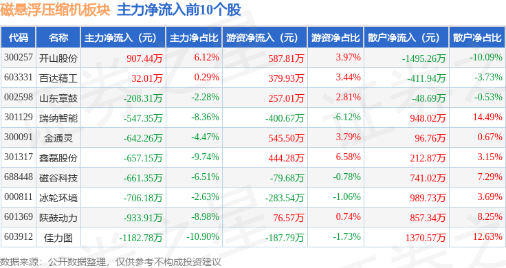 从资金流向上来看,当日磁悬浮压缩机板块主力资金净流出9453.4万元,游资资金净流出5442.31万元,散户资金净流入1.49亿元。磁悬浮压缩机板块个股资金流向见下表: