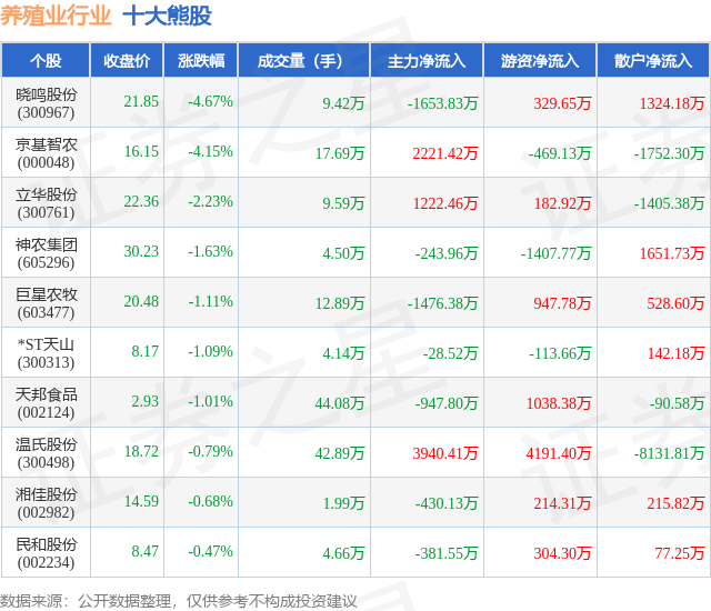 个股表现方面,养殖业行业当日领跌股为晓鸣股份(300967),该股当日报收21.85,下跌4.67%,成交量9.42万,主力资金净流出1653.83万元。京基智农(000048)以下跌4.15%紧随其后,该股当日成交量17.69万,主力资金净流入2221.42万元。除此之外,立华股份(300761)、神农集团(605296)、巨星农牧(603477)均进入当日熊股之列。具体个股列表见下表: