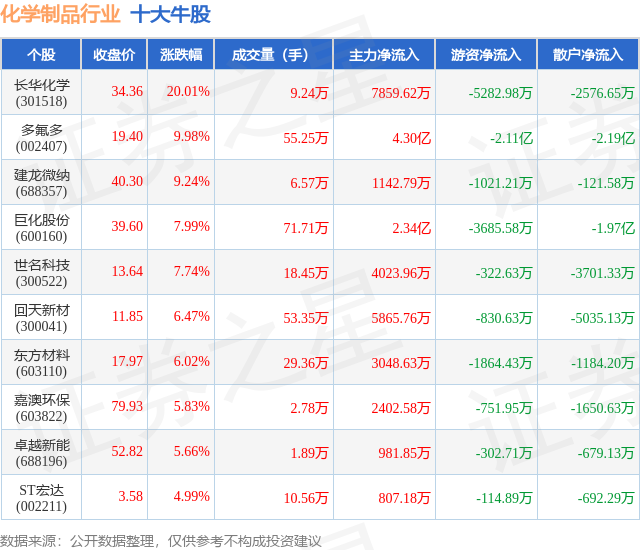 个股表现方面,化学制品行业当日领涨股为长华化学(301518),该股当日报收34.36,上涨20.01%,成交量9.24万,主力资金净流入7859.62万元。多氟多(002407)以上涨9.98%紧随其后,该股当日成交量55.25万,主力资金净流入4.3亿元。除此之外,建龙微纳(688357)、巨化股份(600160)、世名科技(300522)均进入当日牛股之列。具体个股列表见下表: