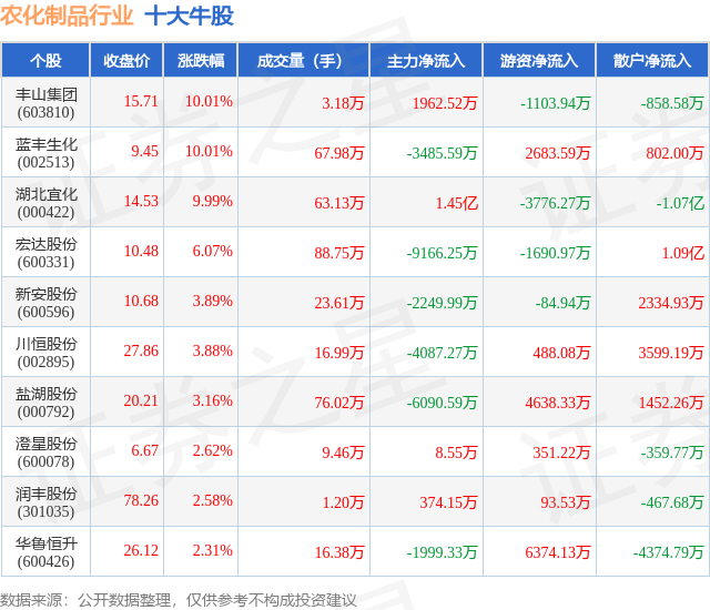 个股表现方面,农化制品行业当日领涨股为丰山集团(603810),该股当日报收15.71,上涨10.01%,成交量3.18万,主力资金净流入1962.52万元。蓝丰生化(002513)以上涨10.01%紧随其后,该股当日成交量67.98万,主力资金净流出3485.59万元。除此之外,湖北宜化(000422)、宏达股份(600331)、新安股份(600596)均进入当日牛股之列。具体个股列表见下表:
