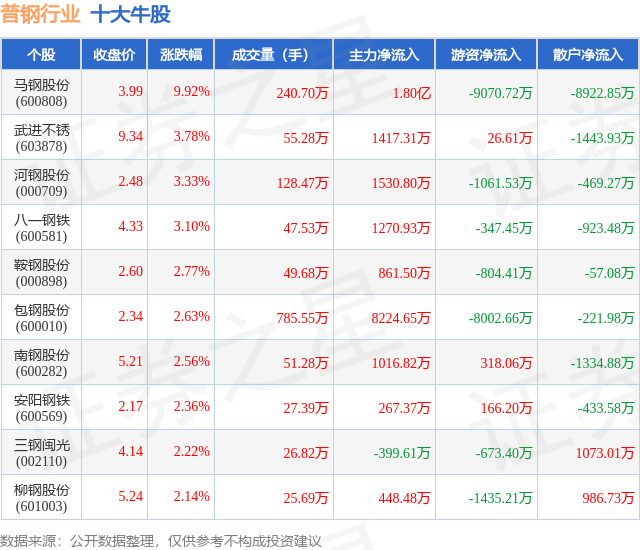 个股表现方面,普钢行业当日领涨股为马钢股份(600808),该股当日报收3.99,上涨9.92%,成交量240.7万,主力资金净流入1.8亿元。武进不锈(603878)以上涨3.78%紧随其后,该股当日成交量55.28万,主力资金净流入1417.31万元。除此之外,河钢股份(000709)、八一钢铁(600581)、鞍钢股份(000898)均进入当日牛股之列。具体个股列表见下表: