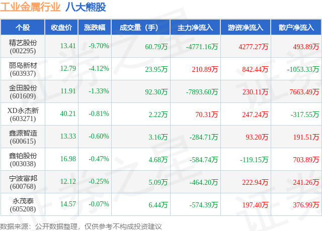 个股表现方面,工业金属行业当日领跌股为精艺股份(002295),该股当日报收13.41,下跌9.7%,成交量60.79万,主力资金净流出4771.16万元。丽岛新材(603937)以下跌4.12%紧随其后,该股当日成交量23.95万,主力资金净流入210.89万元。除此之外,金田股份(601609)、XD永杰新(603271)、鑫源智造(600615)均进入当日熊股之列。具体个股列表见下表: