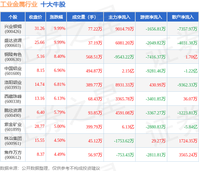 个股表现方面,工业金属行业当日领涨股为兴业银锡(000426),该股当日报收31.26,上涨9.99%,成交量77.22万,主力资金净流入9014.79万元。盛达资源(000603)以上涨9.99%紧随其后,该股当日成交量37.19万,主力资金净流入6081.2万元。除此之外,铜陵有色(000630)、中国铝业(601600)、洛阳钼业(603993)均进入当日牛股之列。具体个股列表见下表:
