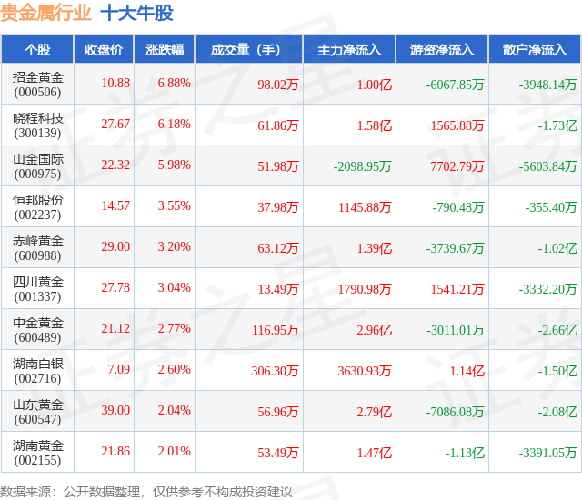 个股表现方面,贵金属行业当日领涨股为招金黄金(000506),该股当日报收10.88,上涨6.88%,成交量98.02万,主力资金净流入1.0亿元。晓程科技(300139)以上涨6.18%紧随其后,该股当日成交量61.86万,主力资金净流入1.58亿元。除此之外,山金国际(000975)、恒邦股份(002237)、赤峰黄金(600988)均进入当日牛股之列。具体个股列表见下表:
