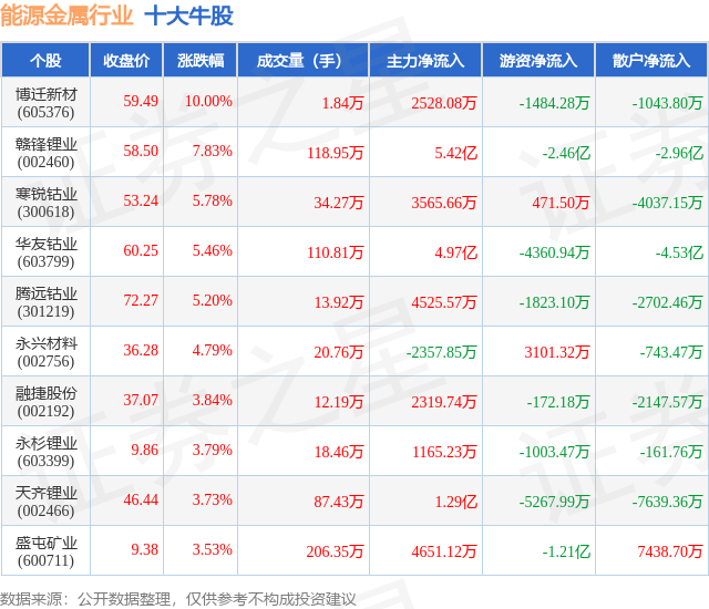 个股表现方面,能源金属行业当日领涨股为博迁新材(605376),该股当日报收59.49,上涨10.0%,成交量1.84万,主力资金净流入2528.08万元。赣锋锂业(002460)以上涨7.83%紧随其后,该股当日成交量118.95万,主力资金净流入5.42亿元。除此之外,寒锐钴业(300618)、华友钴业(603799)、腾远钴业(301219)均进入当日牛股之列。具体个股列表见下表: