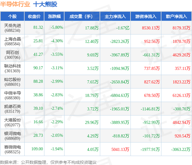 个股表现方面,半导体行业当日领跌股为天岳先进(688234),该股当日报收81.32,下跌5.8%,成交量17.88万,主力资金净流出1.67亿元。上海合晶(688584)以下跌4.3%紧随其后,该股当日成交量12.4万,主力资金净流出2823.26万元。除此之外,阿石创(300706)、联动科技(301369)、灿芯股份(688691)均进入当日熊股之列。具体个股列表见下表: