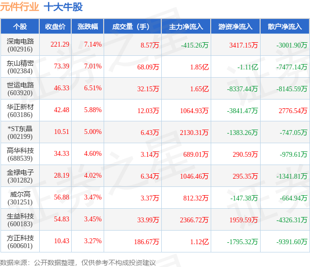 个股表现方面,元件行业当日领涨股为深南电路(002916),该股当日报收221.29,上涨7.14%,成交量8.57万,主力资金净流出415.26万元。东山精密(002384)以上涨7.01%紧随其后,该股当日成交量68.09万,主力资金净流入1.85亿元。除此之外,世运电路(603920)、华正新材(603186)、*ST东晶(002199)均进入当日牛股之列。具体个股列表见下表: