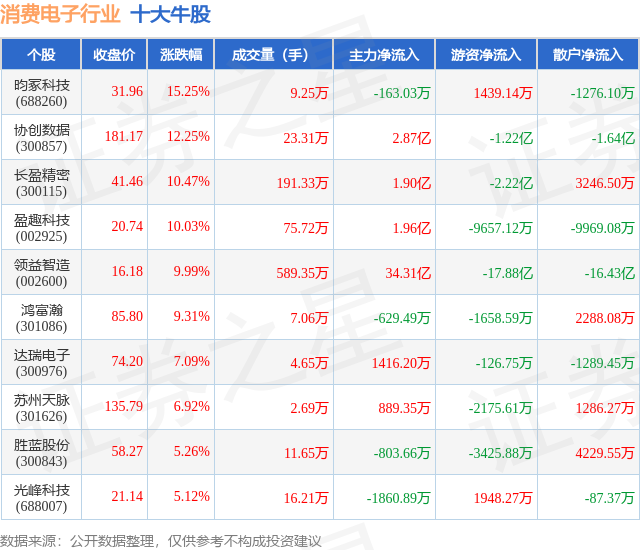 个股表现方面,消费电子行业当日领涨股为昀冢科技(688260),该股当日报收31.96,上涨15.25%,成交量9.25万,主力资金净流出163.03万元。协创数据(300857)以上涨12.25%紧随其后,该股当日成交量23.31万,主力资金净流入2.87亿元。除此之外,长盈精密(300115)、盈趣科技(002925)、领益智造(002600)均进入当日牛股之列。具体个股列表见下表: