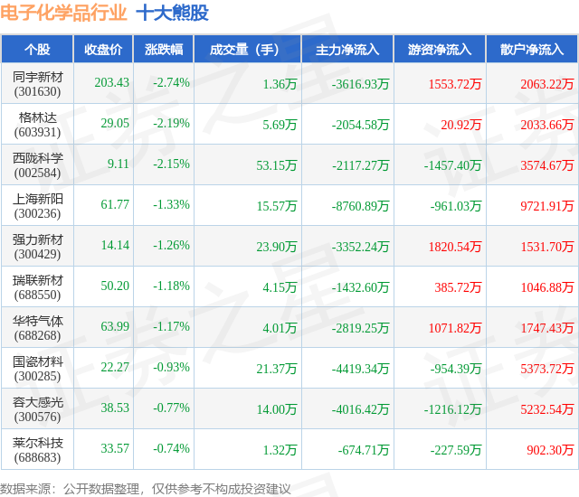 个股表现方面,电子化学品行业当日领跌股为同宇新材(301630),该股当日报收203.43,下跌2.74%,成交量1.36万,主力资金净流出3616.93万元。格林达(603931)以下跌2.19%紧随其后,该股当日成交量5.69万,主力资金净流出2054.58万元。除此之外,西陇科学(002584)、上海新阳(300236)、强力新材(300429)均进入当日熊股之列。具体个股列表见下表: