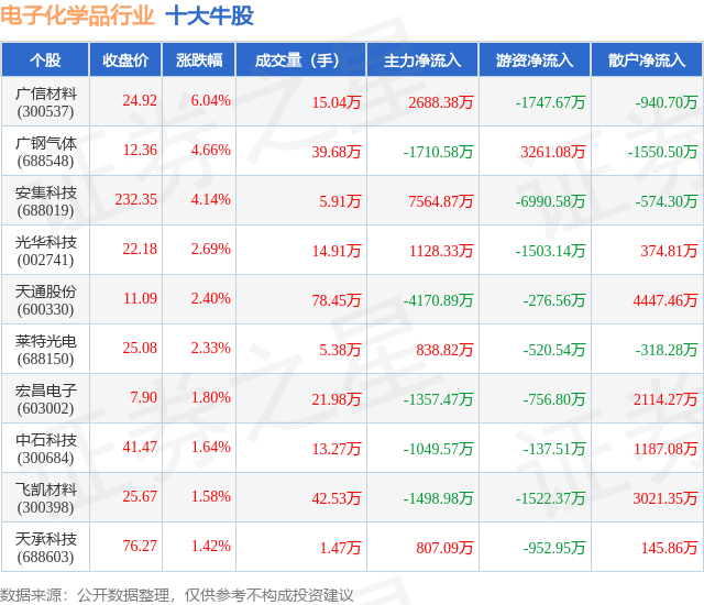 个股表现方面,电子化学品行业当日领涨股为广信材料(300537),该股当日报收24.92,上涨6.04%,成交量15.04万,主力资金净流入2688.38万元。广钢气体(688548)以上涨4.66%紧随其后,该股当日成交量39.68万,主力资金净流出1710.58万元。除此之外,安集科技(688019)、光华科技(002741)、天通股份(600330)均进入当日牛股之列。具体个股列表见下表: