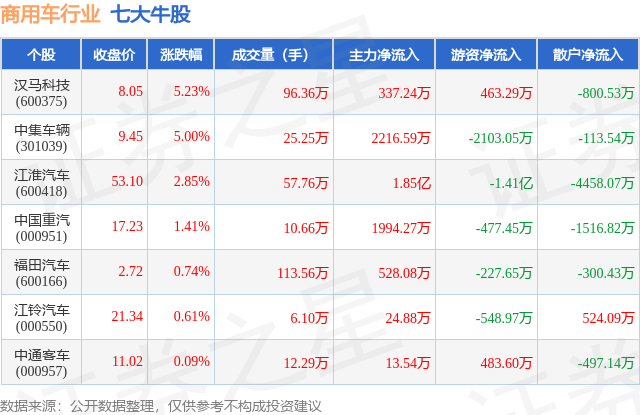 个股表现方面,商用车行业当日领涨股为汉马科技(600375),该股当日报收8.05,上涨5.23%,成交量96.36万,主力资金净流入337.24万元。中集车辆(301039)以上涨5.0%紧随其后,该股当日成交量25.25万,主力资金净流入2216.59万元。除此之外,江淮汽车(600418)、中国重汽(000951)、福田汽车(600166)均进入当日牛股之列。具体个股列表见下表: