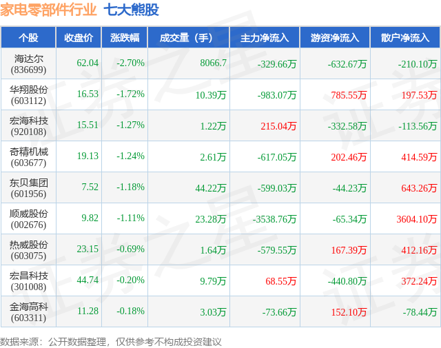 个股表现方面,家电零部件行业当日领跌股为海达尔(836699),该股当日报收62.04,下跌2.7%,成交量8067.0,主力资金净流出329.66万元。华翔股份(603112)以下跌1.72%紧随其后,该股当日成交量10.39万,主力资金净流出983.07万元。除此之外,宏海科技(920108)、奇精机械(603677)、东贝集团(601956)均进入当日熊股之列。具体个股列表见下表: