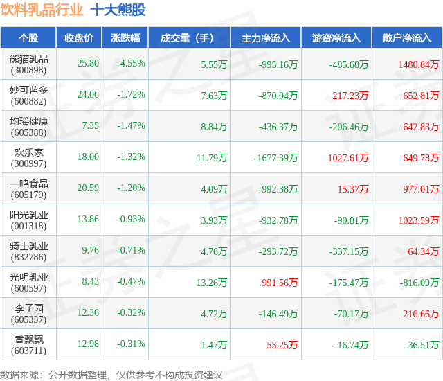 个股表现方面,饮料乳品行业当日领跌股为熊猫乳品(300898),该股当日报收25.8,下跌4.55%,成交量5.55万,主力资金净流出995.16万元。妙可蓝多(600882)以下跌1.72%紧随其后,该股当日成交量7.63万,主力资金净流出870.04万元。除此之外,均瑶健康(605388)、欢乐家(300997)、一鸣食品(605179)均进入当日熊股之列。具体个股列表见下表: