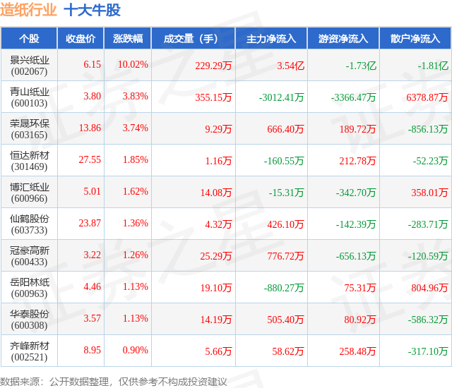 个股表现方面,造纸行业当日领涨股为景兴纸业(002067),该股当日报收6.15,上涨10.02%,成交量229.29万,主力资金净流入3.54亿元。青山纸业(600103)以上涨3.83%紧随其后,该股当日成交量355.15万,主力资金净流出3012.41万元。除此之外,荣晟环保(603165)、恒达新材(301469)、博汇纸业(600966)均进入当日牛股之列。具体个股列表见下表: