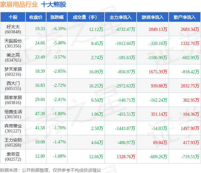 个股表现方面,家居用品行业当日领跌股为好太太(603848),该股当日报收19.33,下跌6.39%,成交量12.12万,主力资金净流出4732.47万元。天振股份(301356)以下跌5.48%紧随其后,该股当日成交量8.45万,主力资金净流出1012.6万元。除此之外,美之高(834765)、梦天家居(603216)、西大门(605155)均进入当日熊股之列。具体个股列表见下表: