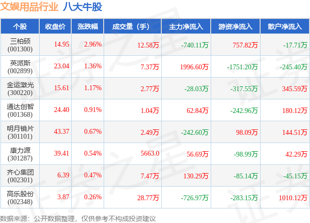 个股表现方面,文娱用品行业当日领涨股为三柏硕(001300),该股当日报收14.95,上涨2.96%,成交量12.58万,主力资金净流出740.11万元。英派斯(002899)以上涨1.36%紧随其后,该股当日成交量7.37万,主力资金净流入1996.6万元。除此之外,金运激光(300220)、通达创智(001368)、明月镜片(301101)均进入当日牛股之列。具体个股列表见下表: