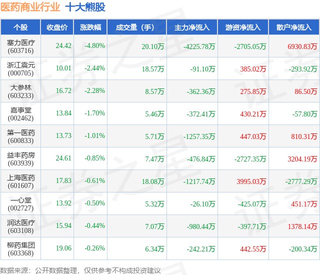 个股表现方面,医药商业行业当日领跌股为塞力医疗(603716),该股当日报收24.42,下跌4.8%,成交量20.1万,主力资金净流出4225.78万元。浙江震元(000705)以下跌2.44%紧随其后,该股当日成交量18.57万,主力资金净流出91.1万元。除此之外,大参林(603233)、嘉事堂(002462)、第一医药(600833)均进入当日熊股之列。具体个股列表见下表: