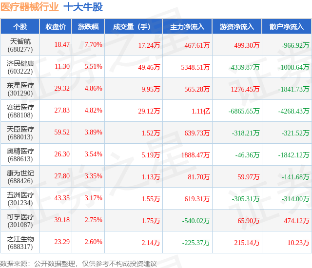 个股表现方面,医疗器械行业当日领涨股为天智航(688277),该股当日报收18.47,上涨7.7%,成交量17.24万,主力资金净流入467.61万元。济民健康(603222)以上涨5.51%紧随其后,该股当日成交量49.46万,主力资金净流入5348.51万元。除此之外,东星医疗(301290)、赛诺医疗(688108)、天臣医疗(688013)均进入当日牛股之列。具体个股列表见下表: