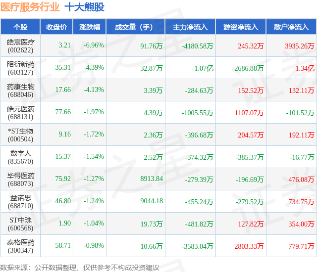 个股表现方面,医疗服务行业当日领跌股为皓宸医疗(002622),该股当日报收3.21,下跌6.96%,成交量91.76万,主力资金净流出4180.58万元。昭衍新药(603127)以下跌4.39%紧随其后,该股当日成交量32.87万,主力资金净流出1.07亿元。除此之外,药康生物(688046)、皓元医药(688131)、*ST生物(000504)均进入当日熊股之列。具体个股列表见下表: