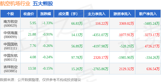 个股表现方面,航空机场行业当日领跌股为南方航空(600029),该股当日报收5.95,下跌1.33%,成交量66.83万,主力资金净流入116.22万元。中信海直(000099)以下跌0.91%紧随其后,该股当日成交量14.13万,主力资金净流出4351.07万元。除此之外,中国国航(601111)、中国东航(600115)、吉祥航空(603885)均进入当日熊股之列。具体个股列表见下表: