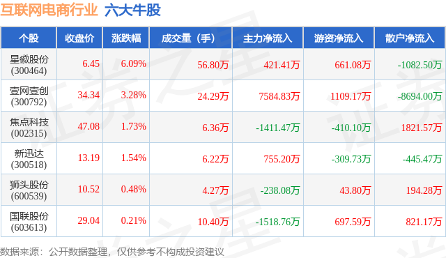 个股表现方面,互联网电商行业当日领涨股为星徽股份(300464),该股当日报收6.45,上涨6.09%,成交量56.8万,主力资金净流入421.41万元。壹网壹创(300792)以上涨3.28%紧随其后,该股当日成交量24.29万,主力资金净流入7584.83万元。除此之外,焦点科技(002315)、新迅达(300518)、狮头股份(600539)均进入当日牛股之列。具体个股列表见下表: