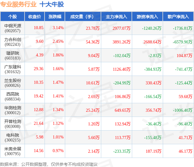 个股表现方面,专业服务行业当日领涨股为中钢天源(002057),该股当日报收10.85,上涨3.14%,成交量23.78万,主力资金净流入2977.07万元。力合科创(002243)以上涨2.45%紧随其后,该股当日成交量54.36万,主力资金净流入3891.26万元。除此之外,建研院(603183)、广东建科(301632)、兰生股份(600826)均进入当日牛股之列。具体个股列表见下表: