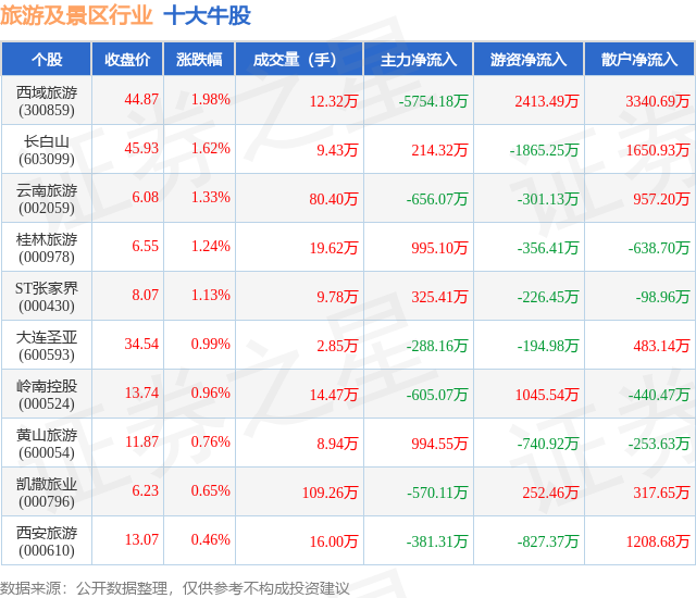 个股表现方面,旅游及景区行业当日领涨股为西域旅游(300859),该股当日报收44.87,上涨1.98%,成交量12.32万,主力资金净流出5754.18万元。长白山(603099)以上涨1.62%紧随其后,该股当日成交量9.43万,主力资金净流入214.32万元。除此之外,云南旅游(002059)、桂林旅游(000978)、ST张家界(000430)均进入当日牛股之列。具体个股列表见下表: