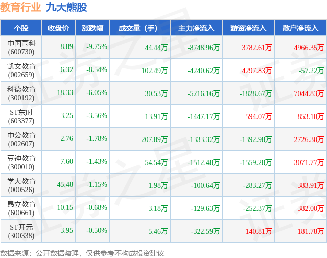 个股表现方面,教育行业当日领跌股为中国高科(600730),该股当日报收8.89,下跌9.75%,成交量44.44万,主力资金净流出8748.96万元。凯文教育(002659)以下跌8.54%紧随其后,该股当日成交量102.49万,主力资金净流出4240.62万元。除此之外,科德教育(300192)、ST东时(603377)、中公教育(002607)均进入当日熊股之列。具体个股列表见下表: