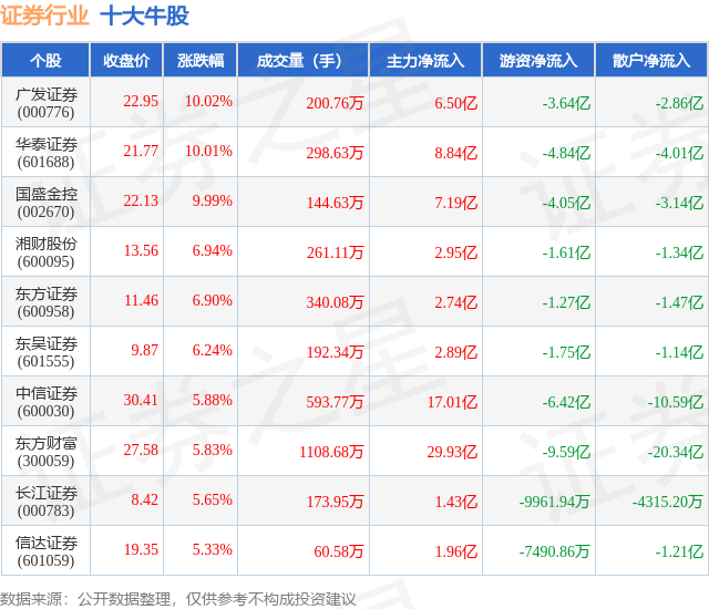个股表现方面,证券行业当日领涨股为广发证券(000776),该股当日报收22.95,上涨10.02%,成交量200.76万,主力资金净流入6.5亿元。华泰证券(601688)以上涨10.01%紧随其后,该股当日成交量298.63万,主力资金净流入8.84亿元。除此之外,国盛金控(002670)、湘财股份(600095)、东方证券(600958)均进入当日牛股之列。具体个股列表见下表:
