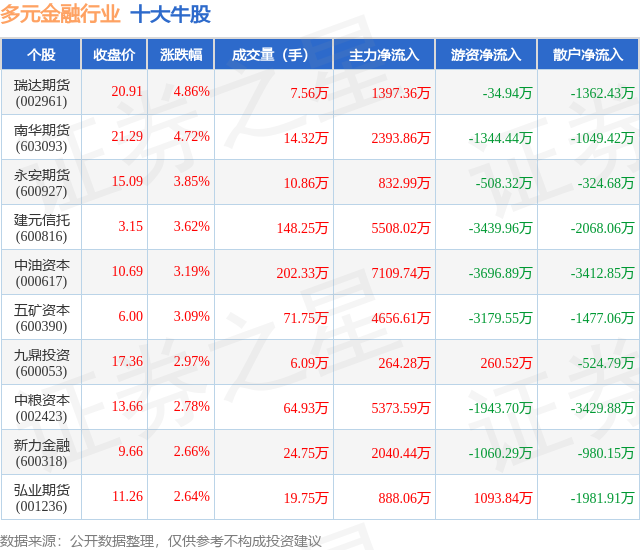 个股表现方面,多元金融行业当日领涨股为瑞达期货(002961),该股当日报收20.91,上涨4.86%,成交量7.56万,主力资金净流入1397.36万元。南华期货(603093)以上涨4.72%紧随其后,该股当日成交量14.32万,主力资金净流入2393.86万元。除此之外,永安期货(600927)、建元信托(600816)、中油资本(000617)均进入当日牛股之列。具体个股列表见下表: