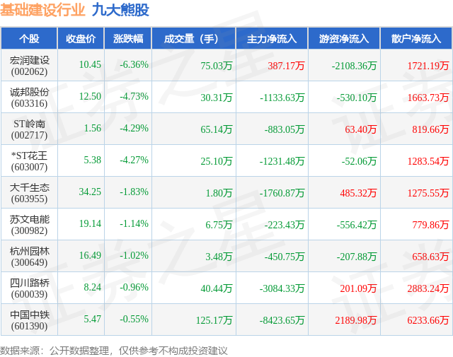 个股表现方面,基础建设行业当日领跌股为宏润建设(002062),该股当日报收10.45,下跌6.36%,成交量75.03万,主力资金净流入387.17万元。诚邦股份(603316)以下跌4.73%紧随其后,该股当日成交量30.31万,主力资金净流出1133.63万元。除此之外,ST岭南(002717)、*ST花王(603007)、大千生态(603955)均进入当日熊股之列。具体个股列表见下表: